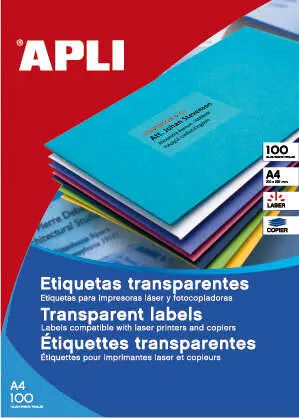 Etiquetas translúcidas cantos rectos tamaño 70,0 x 37,0 mm con adhesivo permanente. Pack con 100 hojas (2.400 etiquetas).