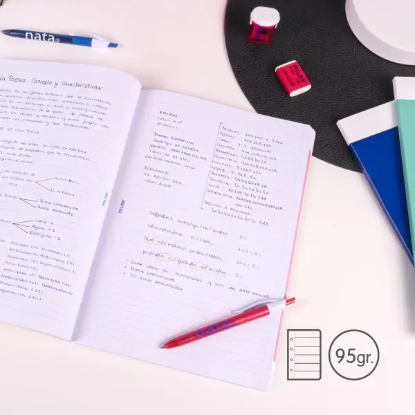 Libretas A4 encoladas (sin grapas) y tapa flexible. 48 hojas de papel pautado a líneas (línea simple de 7 mm). Papel de 95 gr/m² de alta calidad, microperforado. Cubierta de cartón flexible con dos acabados distintos, brillante y mate. Colección MILAN nata® 624 since 1918, inspirada en los colores y diseño originales de las gomas de borrar MILAN, fabricadas en España desde 1918.