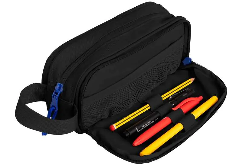 Estuche B-Smart a juego con las mochilas Oxford B-Redy, B-Out y B-Trendy. Fabricado en material reciclado muy resistente con el interior a juego. Cuenta con tres compartimentos. Un compartimento principal, otro lateral con obertura total con portabolis y una malla para guardar cosas más pequeñas. También tiene un compartimento más pequeño en la parte posterior. Tiene una asa lateral para transportar y dispone de tira Kangoo para acoplarlo a los cuadernos,