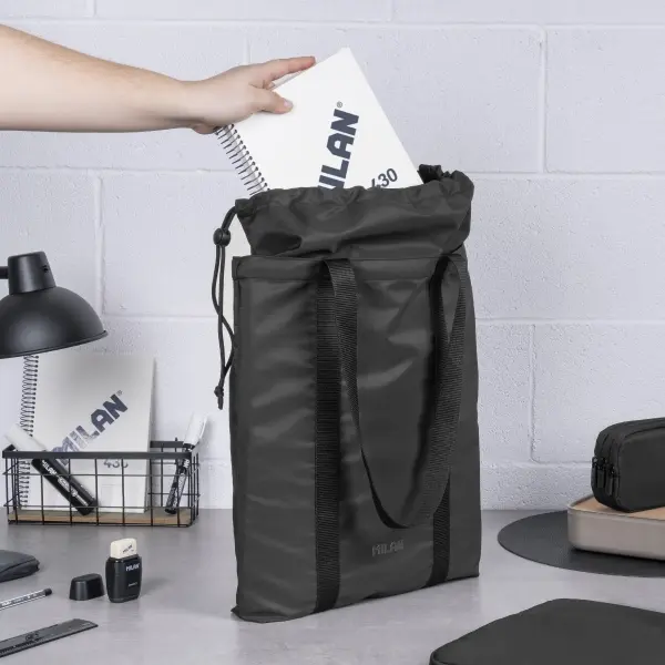 Bolso tote bag negro de la marca Milan, fabricado en poliéster suave y duradero, con cierre de cordón, asas de tela y diseño minimalista y elegante.