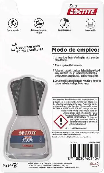 -Aplicación con pincel – Loctite Super Glue-3 Pincel es un pegamento líquido de fácil uso, antigoteo, limpio y seguro. Las superficies a pegar deben estar limpias y secas.
