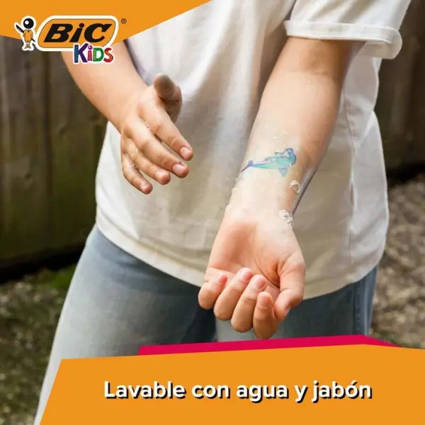 El kit de tatuajes temporales BIC Kids incluye 3 bolígrafos, 10 plantillas y 3 sellos para horas de expresión creativa en la piel. Limpie la tinta de grado cosmético con agua y jabón para preparar la piel para futuras ideas con fórmulas sin fragancia.