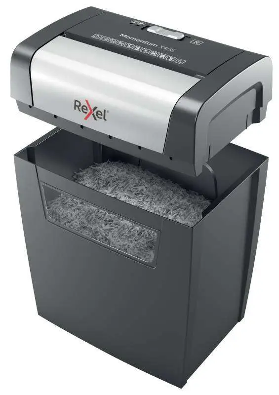 ¡La potencia para destruir más! La destructora de papel Rexel Momentum X406 destruye hasta 6 hojas de una vez, funciona ininterrumpidamente durante 3 minutos y es ideal para uso doméstico. P4, corte en confeti (partículas de 4 × 30 mm).