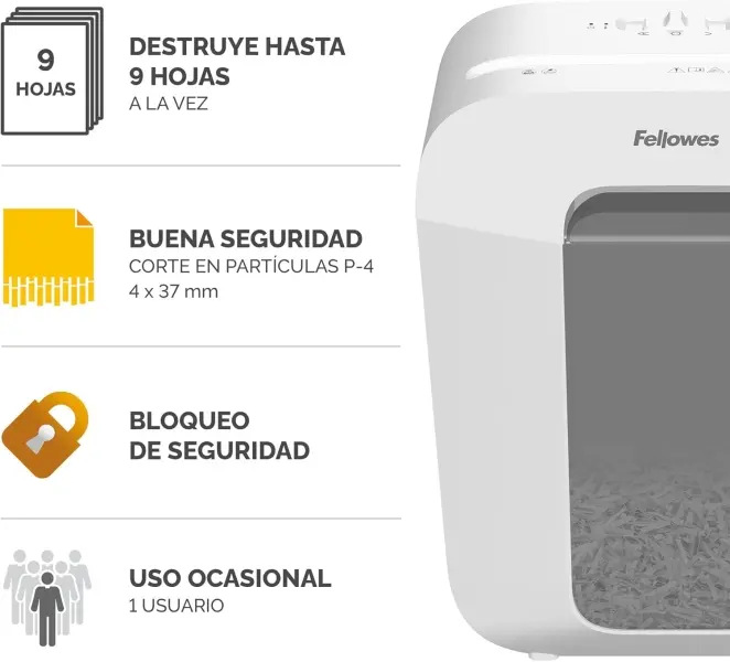-Destruye hasta 9 hojas en partículas de 4x37 mm (Din P-4).