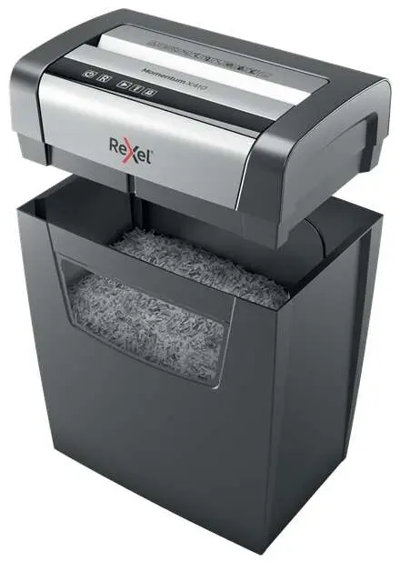 La destructora de papel Rexel Momentum X410 destruye hasta 10 hojas de una vez, funciona ininterrumpidamente durante 6 minutos y es ideal para uso doméstico. La tecnología antiatasco del modelo X410 garantiza el funcionamiento ininterrumpido. P4, corte cruzado (partículas de 4 × 28 mm). Trituradora silenciosa con botones táctiles sencillos e intuitivos y una generosa papelera de 23 litros de capacidad (225 hojas A4).