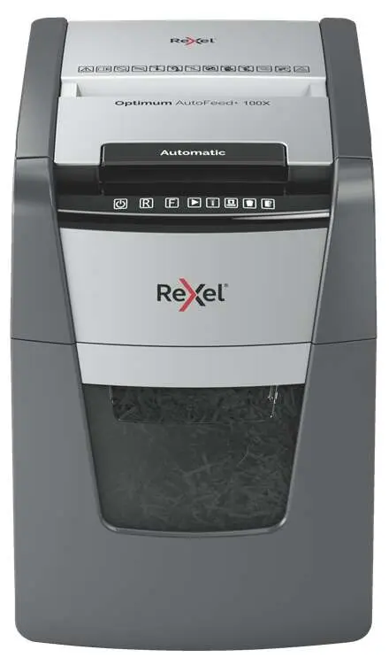Rexel Optimum AutoFeed 100X Destructora Automatica de Corte en Particulas P-4 - Alimentacion Automatica 100 Hojas y Manual 8 Hoj
