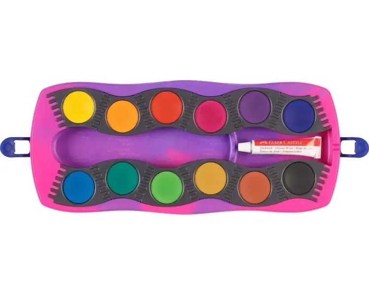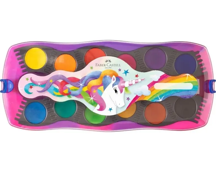 Faber-Castell Connector Unicornio Pack de 12 Acuarelas en Pastilla + Pintura Blanca Opaca + Pegatinas - Gran Opacidad - Facilmen