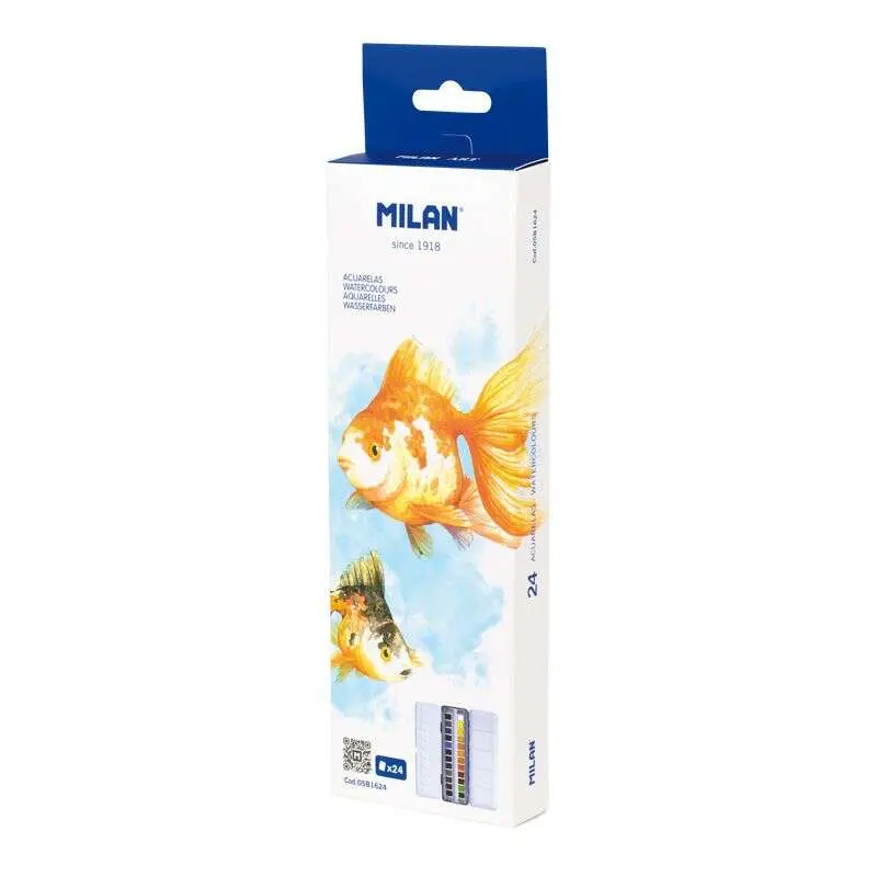 Estuche metálico con 24 pastillas medios godet de acuarela MILAN Art, con bandeja abatible y anilla posterior. Sus colores se obtienen a partir de pigmentos inocuos, son opacos y resistentes a la luz. Se mezclan fácilmente entre sí. Indicado para artistas. Se lavan fácilmente sobre la mayoría de tejidos si se realiza en el momento en que el tejido se mancha de pintura. Con envase de cartón con colgador.