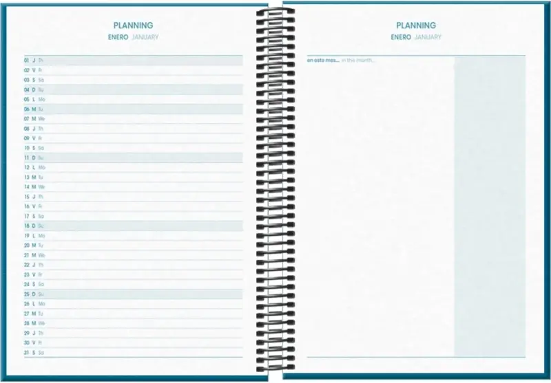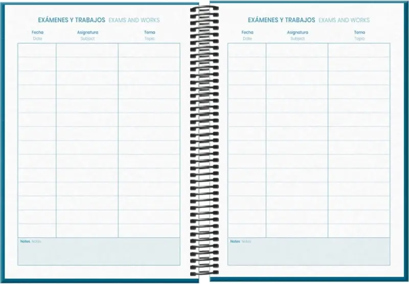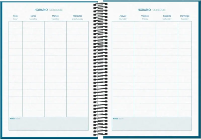 Dohe System Agenda escolar semana vista. Todos los días de la semana en dos hojas. La cubierta está fabricada en cartón forrado con papel impreso a todo color y plastificado. Espiral simple metalico.