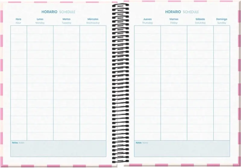 Dohe Cherry Agenda escolar semana vista. Todos los días de la semana en dos hojas. La cubierta está fabricada en cartón forrado con papel impreso a todo color y plastificado. Guardas impresas. Espiral simple de plastico y cierre con goma elástica plana.