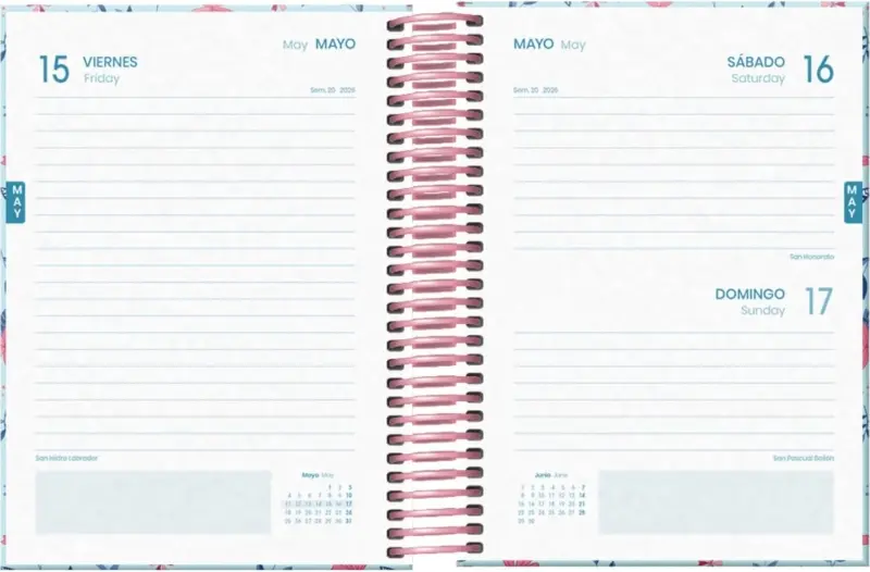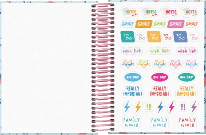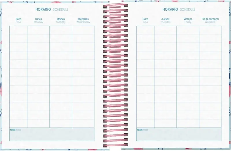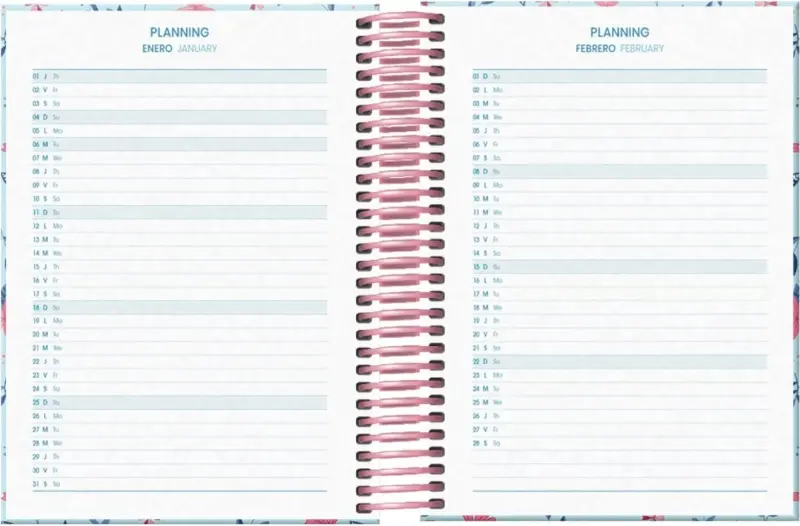 Dohe Blossom Agenda escolar dia pagina. Todos los días de la semana ocupan un página excepto sábado y domingo que comparten hoja. La cubierta está fabricada en cartón forrado con papel impreso a todo color y plastificado. Guardas impresas. Espiral simple de plastico y cierre con goma elástica plana.