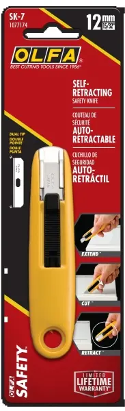 Pequeño, liviano y seguro para llevar en el bolsillo, el cuchillo de seguridad autorretráctil compacto semiautomático OLFA SK-7 es una opción versátil y conveniente para cortar lo básico. El cuerpo compacto y duradero de ABS está fabricado con materiales 100 % reciclados y cuenta con una hoja empotrada para evitar la exposición accidental de la hoja en una bolsa o bolsillo.