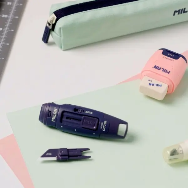 Cúter con hoja de cerámica reemplazable. Diseño STICK, colección 430 since 1918 en color azul marino. Con su forma ergonómica, es perfecto para manualidades o para abrir paquetes. La hoja cerámica corta distintos tipos de material. Dispone de un ojal para poder ser colgado. Hojas cerámicas de recambio disponibles. Colección 430 since 1918, inspirada en los colores y diseño originales de las gomas de borrar MILAN, fabricadas en España desde 1918.