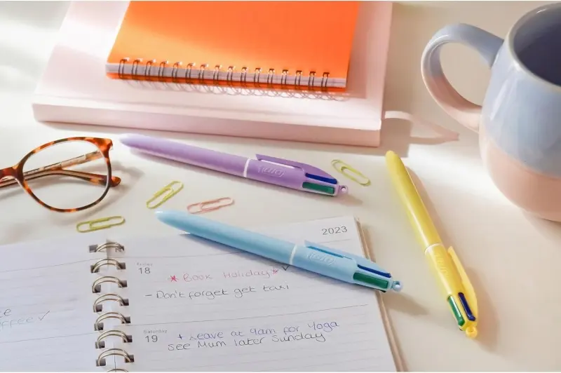 Organízate, toma notas, prepara presentaciones y añade un toque personal a cada cosa que hagas con estos divertidos bolígrafos BIC 4 Colores con diseños pastel.