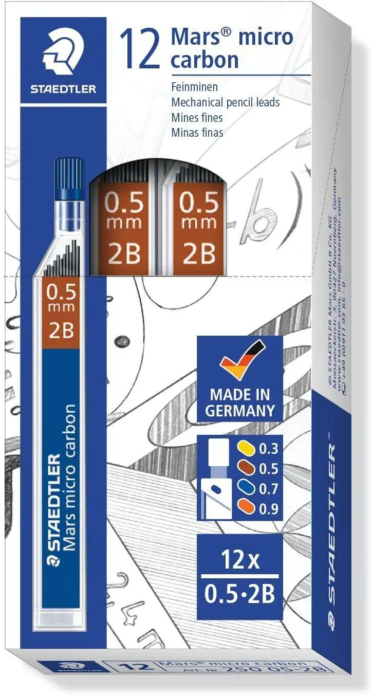 Staedtler Mars Micro Carbon 250 Tubo de 12 Minas de Grafito - Dureza 2B - Trazo 0.5mm - Alta Resistencia