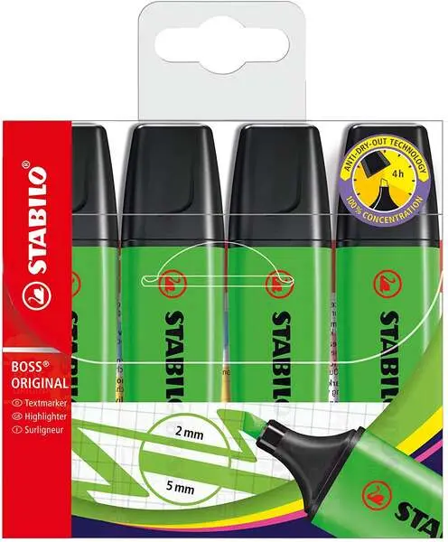 Stabilo Boss 70 Pack de 4 Marcadores Fluorescentes - Trazo entre 2 y 5mm - Recargable - Tinta con Base de Agua - Color Verde