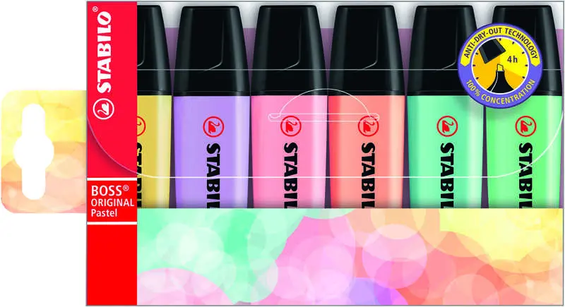 Desde su creación en 1971, el STABILO BOSS ORIGINAL se ha convertido en un favorito dentro del escritorio y continua siendo el fluorescente más vendido en Europa. Ofrece 4 horas de protección antisecado para estar concentrado al 100%, es recargable y está disponible en 9 colores fluorescentes y 6 pastel.