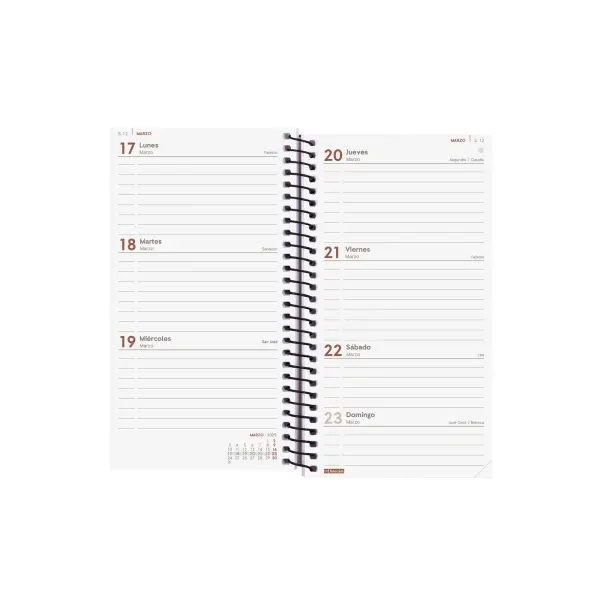 Agenda de espiral de estilo moderno y universal con tapas ligeras de polipropileno. Con goma elástica. Con esquinas microperforadas para localizar rápidamente el día/semana en curso. Agenda con información de interés en la anualidad y otros contenidos extra.