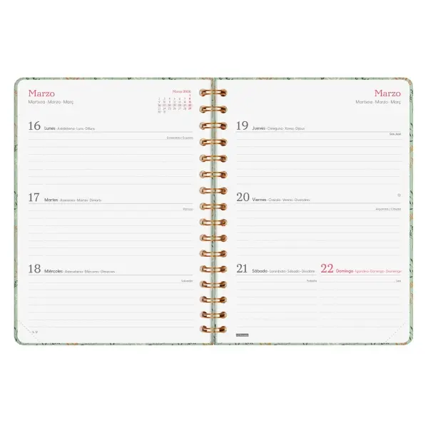 -Contenido: La anualidad de la agenda incluye la información relativa a: onomástica, festivos nacionales, cambios de estación e inicios de los años nuevos chino, musulmán, ortodoxo y hebreo. La agenda dispone también de otros contenidos extra: datos personales, calendarios, horarios, objetivos del año, plan anual, fechas importantes, otras fechas, hojas para checklist, hojas para notas, hoja para ocio, hojas para teléfonos, direcciones y e-mails y dos hojas de pegatinas orientadas a la organización personal.