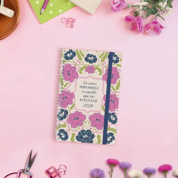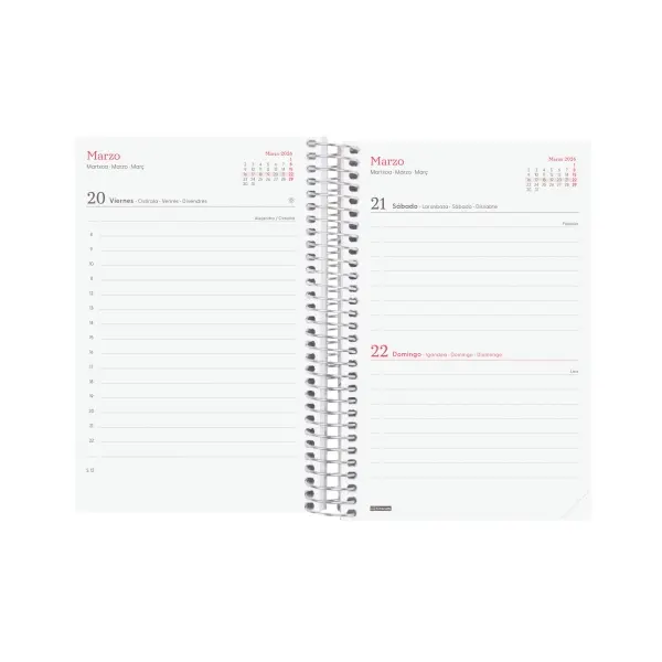 Agenda de espiral con tapas ligeras de polipropileno. Diseño en tendencia y a la moda. Ideal para uso personal y/o profesional. Con goma elástica. Con esquinas microperforadas para localizar rápidamente el día/semana en curso. El diseño interior es limpio y fácil, con espacio suficiente para organizar tus proyectos, tareas y compromisos. Agenda con información de interés en la anualidad y otros contenidos extra orientados a la organización personal.