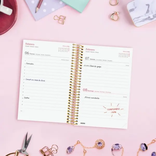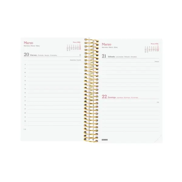 Agenda de espiral con tapas ligeras de polipropileno. Diseño en tendencia y a la moda. Ideal para uso personal y/o profesional. Con goma elástica. Con esquinas microperforadas para localizar rápidamente el día/semana en curso. El diseño interior es limpio y fácil, con espacio suficiente para organizar tus proyectos, tareas y compromisos. Agenda con información de interés en la anualidad y otros contenidos extra orientados a la organización personal.