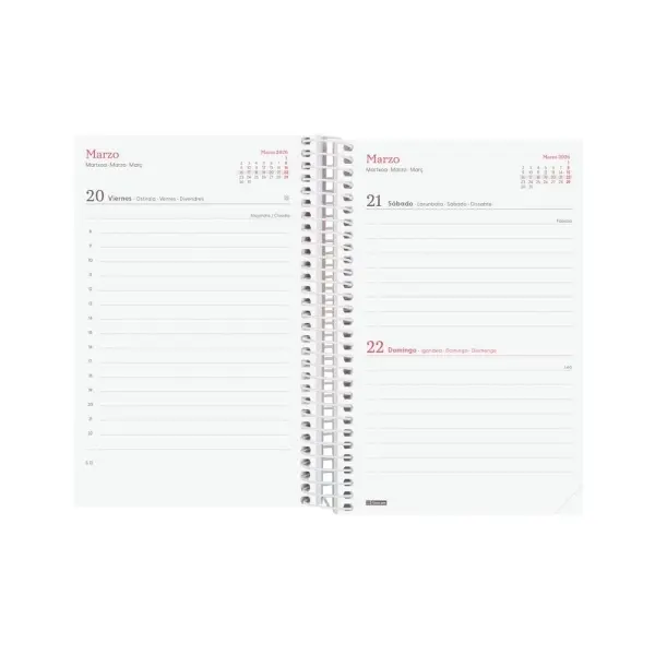 Agenda de espiral con tapas ligeras de polipropileno. Diseño en tendencia y a la moda. Ideal para uso personal y/o profesional. Con goma elástica. Con esquinas microperforadas para localizar rápidamente el día/semana en curso. El diseño interior es limpio y fácil, con espacio suficiente para organizar tus proyectos, tareas y compromisos. Agenda con información de interés en la anualidad y otros contenidos extra orientados a la organización personal.