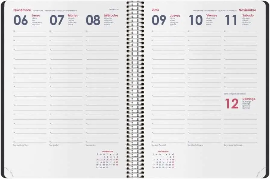 Datos personales, Calendario trienal, Planning del año, Indicativos internacionales, Páginas para anotaciones. Cabeceras en 5 idiomas (Castellano, Catalán, Gallego, Euskera y Portugués), Onomástica, Semana, Calendarios del mes actual y siguiente.