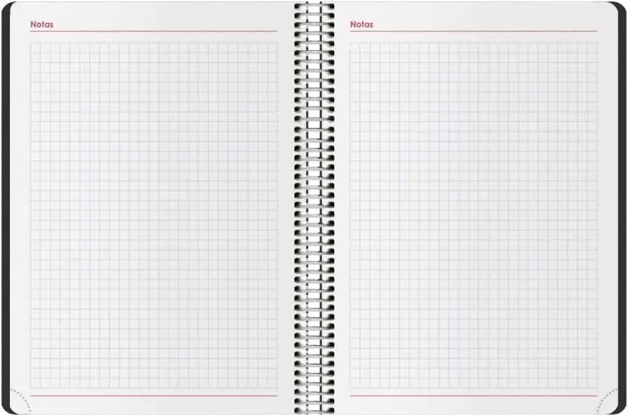 Dohe Syncro agenda anual. Cubierta realizada en tapa de polipropileno opaco, goma elástica y puntas redondeadas. Interior semana vista, impresa a dos colores en papel offset blanco de 70 grs., con 160 páginas.