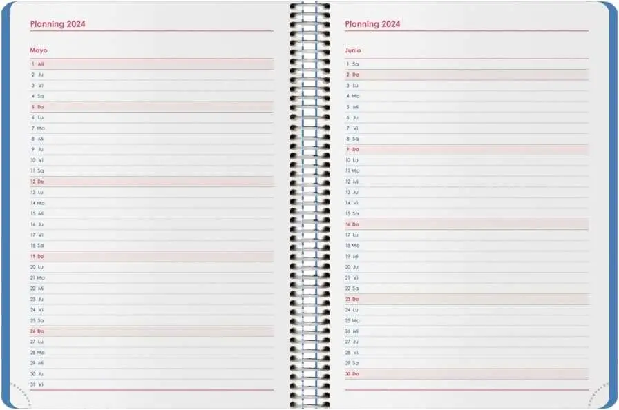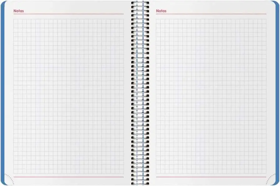 Dohe Syncro agenda anual. Cubierta realizada en tapa de polipropileno opaco, goma elástica y puntas redondeadas. Interior semana vista, impresa a dos colores en papel offset blanco de 70 grs., con 160 páginas.