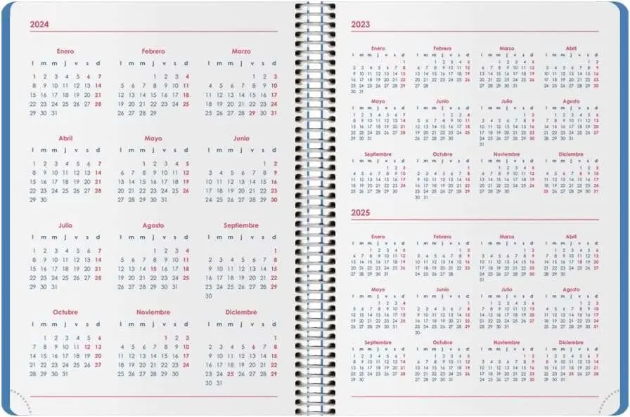 Datos personales, Calendario trienal, Planning del año, Indicativos internacionales, Páginas para anotaciones. Cabeceras en 5 idiomas (Castellano, Catalán, Gallego, Euskera y Portugués), Onomástica, Semana, Calendarios del mes actual y siguiente.
