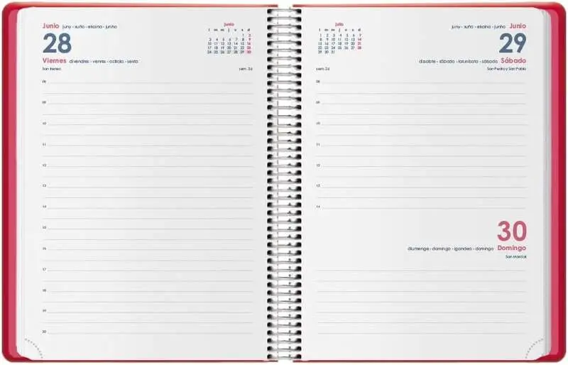 Datos personales, Calendario trienal, Planning del año, Indicativos internacionales, Páginas para anotaciones. Cabeceras en 5 idiomas (Castellano, Catalán, Gallego, Euskera y Portugués), Onomástica, Semana, Calendarios del mes actual y siguiente.